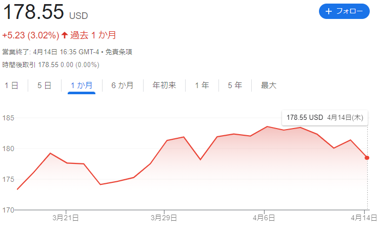 直近 1か月のチャートをみても4月6日あたりがピークでそこから下がっているよね。