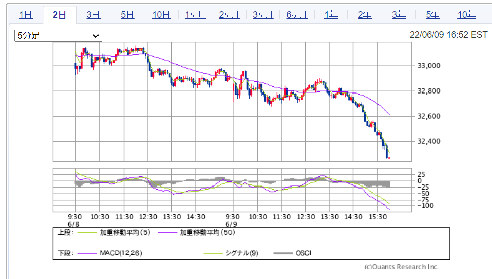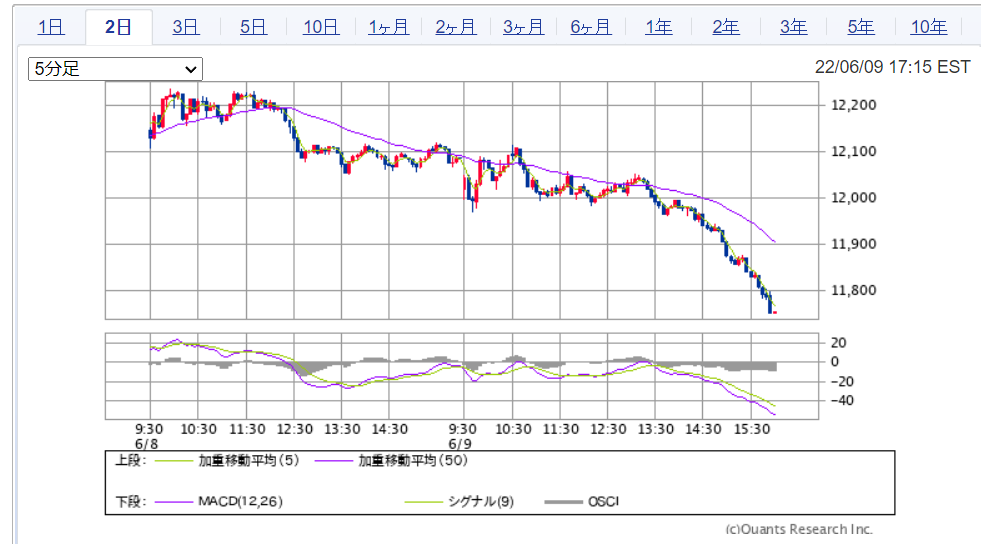 この2日間でのチャートを見ても下落傾向。MACDを見てもシグナル線(グリーン)の下を行っているので、まだまだ下がりますよね。