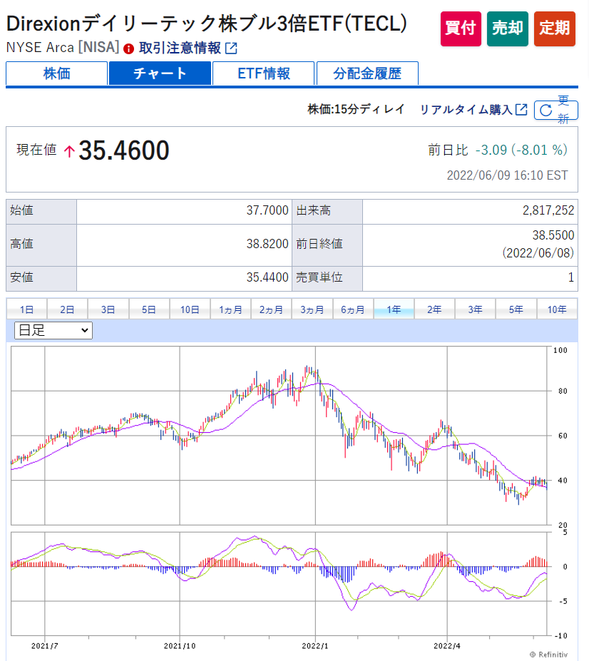 名前の通りテクノロジー分野(TEC)に特化した3倍レバレッジ型(名前の末のLは3倍レバレッジ商品のことみたいです。)のETF商品です。